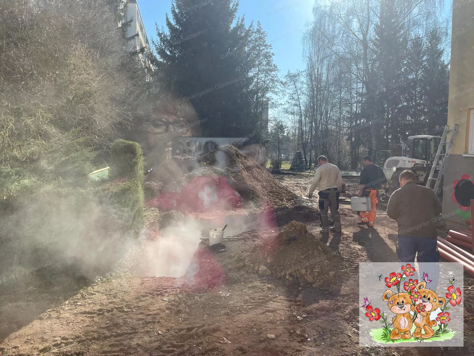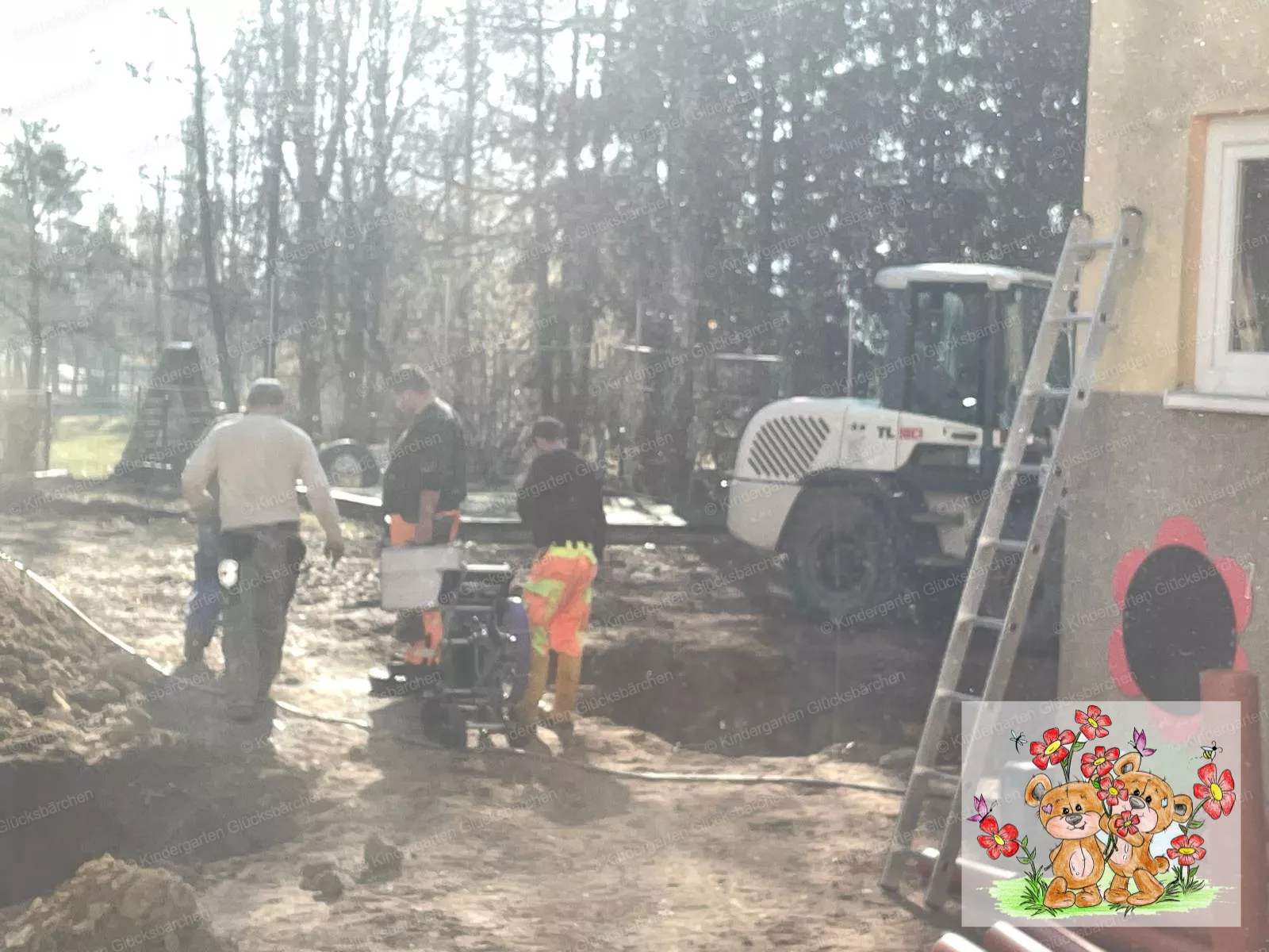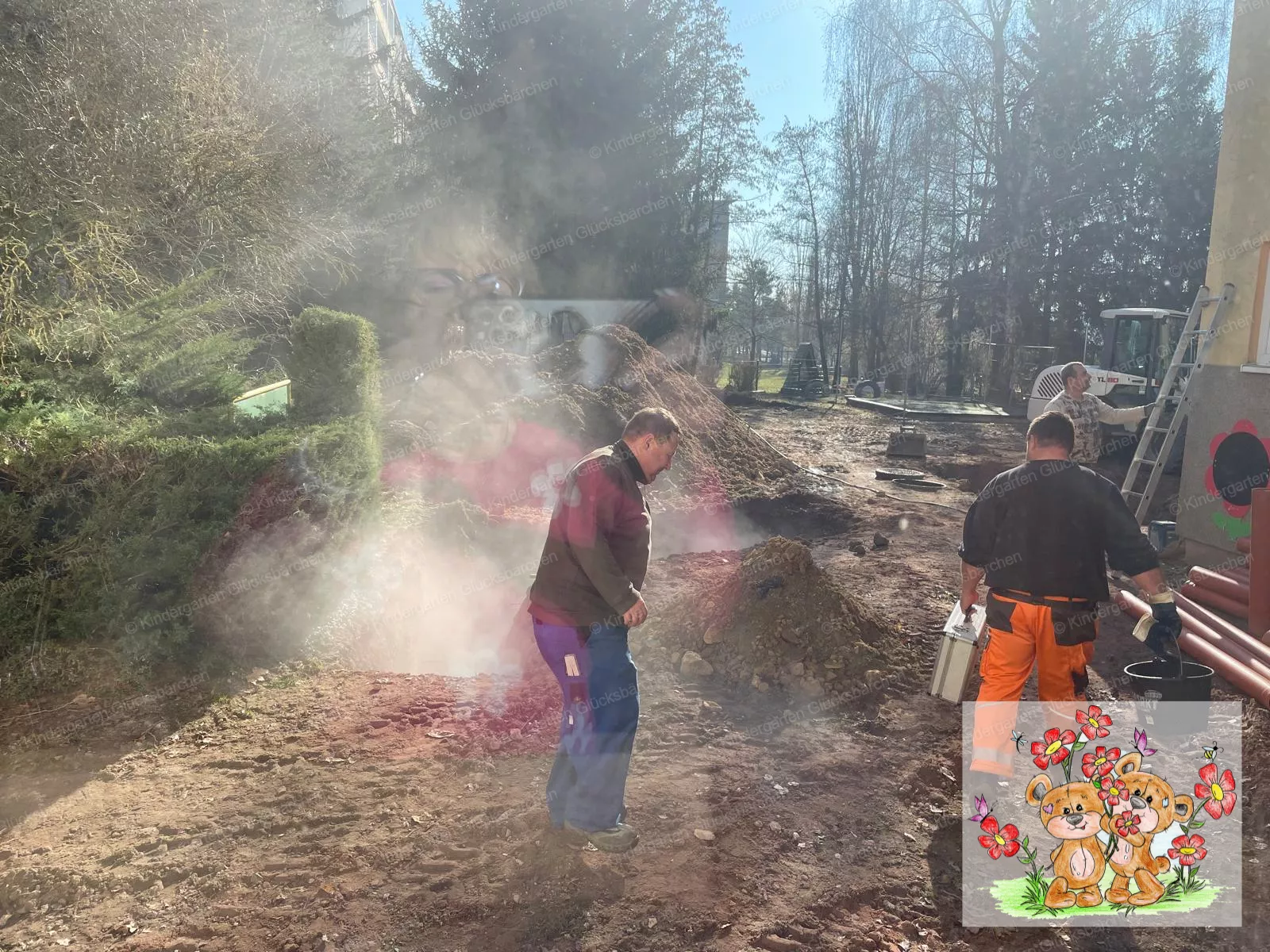 Es ist soweit – unser Spielplatz wird umgestaltet! Zunächst fanden wichtige Kanalarbeiten statt, bei denen die Firma Norman Dostal alle Abwasser- und Brauchwasserleitungen erneuert hat. Die Vorbereitungen für unserer großen Sonnensegel sind ebenfalls abgeschlossen. Jetzt freuen wir uns auf die bunten Pflastersteine, die bald unseren Spielbereich verschönern werden Wir warten auf besserers Wetter, damit die Pflasterarbeiten beginnen können.